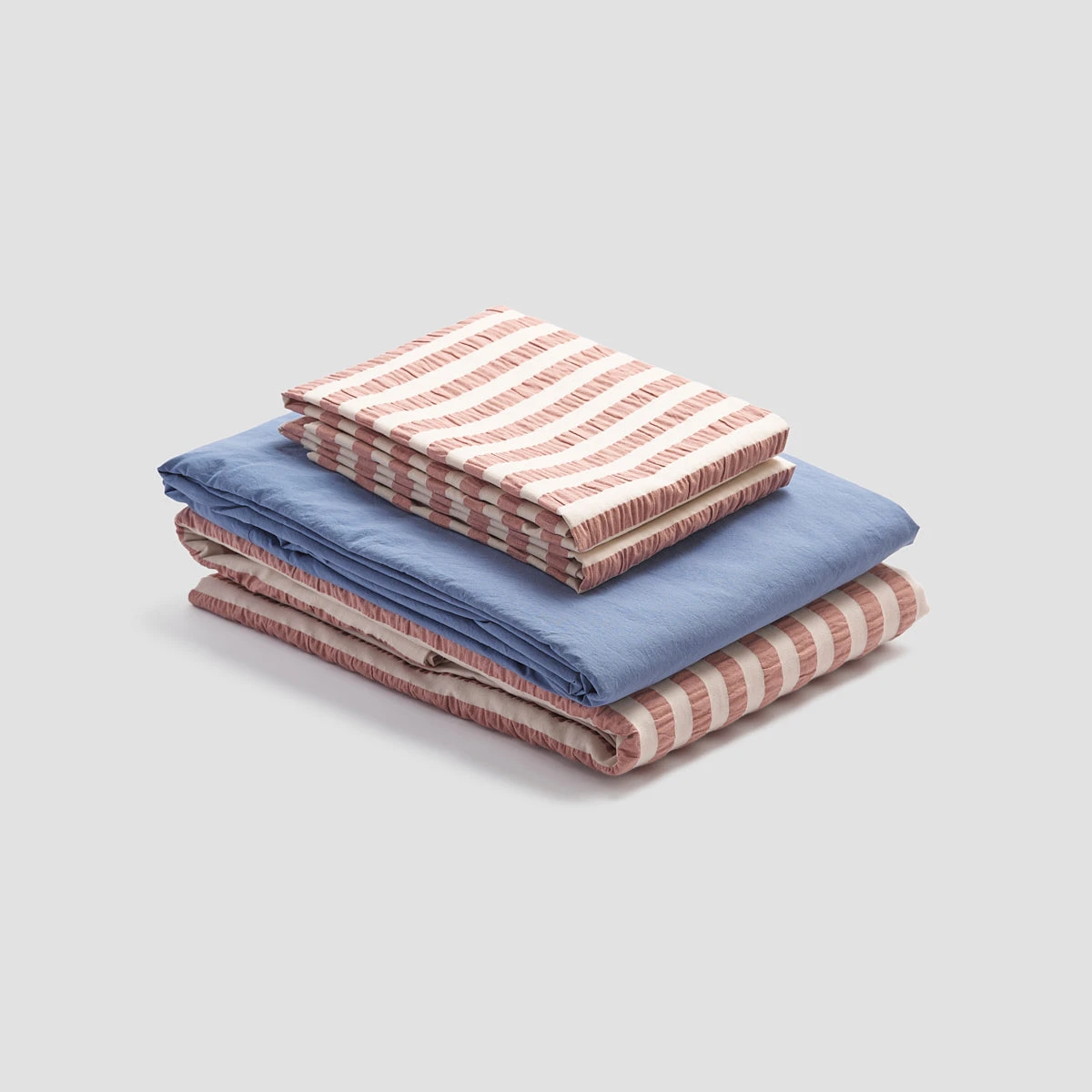 Our Desert Sand Seersucker Stripe Cotton Bundle is inspired by the nostalgia of childhood holidays spent on the British coast. This bundle features an alternate stripe of Parchment and Desert Sand: a deep reddish-pink hue. Made in Portugal from sustainably-sourced cotton, our seersucker stripe cotton bedding is achieved by weaving yarns of different tensions to create a relaxed, puckered effect, allowing for a breathable, cool and comfortable sleep. If you are looking to mix and match our Desert Sand Seersucker Stripe range, our plain washed cotton styles: French Rose, Cove Blue or Mulberry make for a charming bedding ensemble.