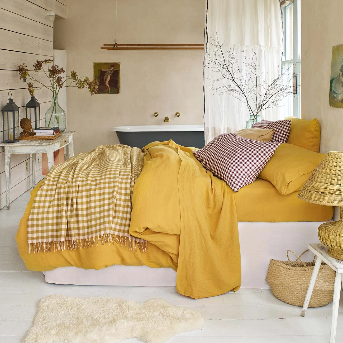 Made for those who want to experience the delights of being totally wrapped in linen, our Honey Bedtime Bundle, a radiant warm shade of yellow, is made from super soft 100% stonewashed European flax. Our Bedtime Bundles consist of a duvet cover, a sheet and a pair of pillowcases. Opt for a consistent Honey color-scheme or contrast with our classic crisp White linen sheets, with the option to add on extras if desired. Linen keeps you cozy and warm in the winter, cool in the summer and is highly breathable. Our linen bedtime bundles make an excellent starter pack for those purchasing a new home, as well as a beautiful wedding present or birthday gift for lovers of high quality, natural home decor.