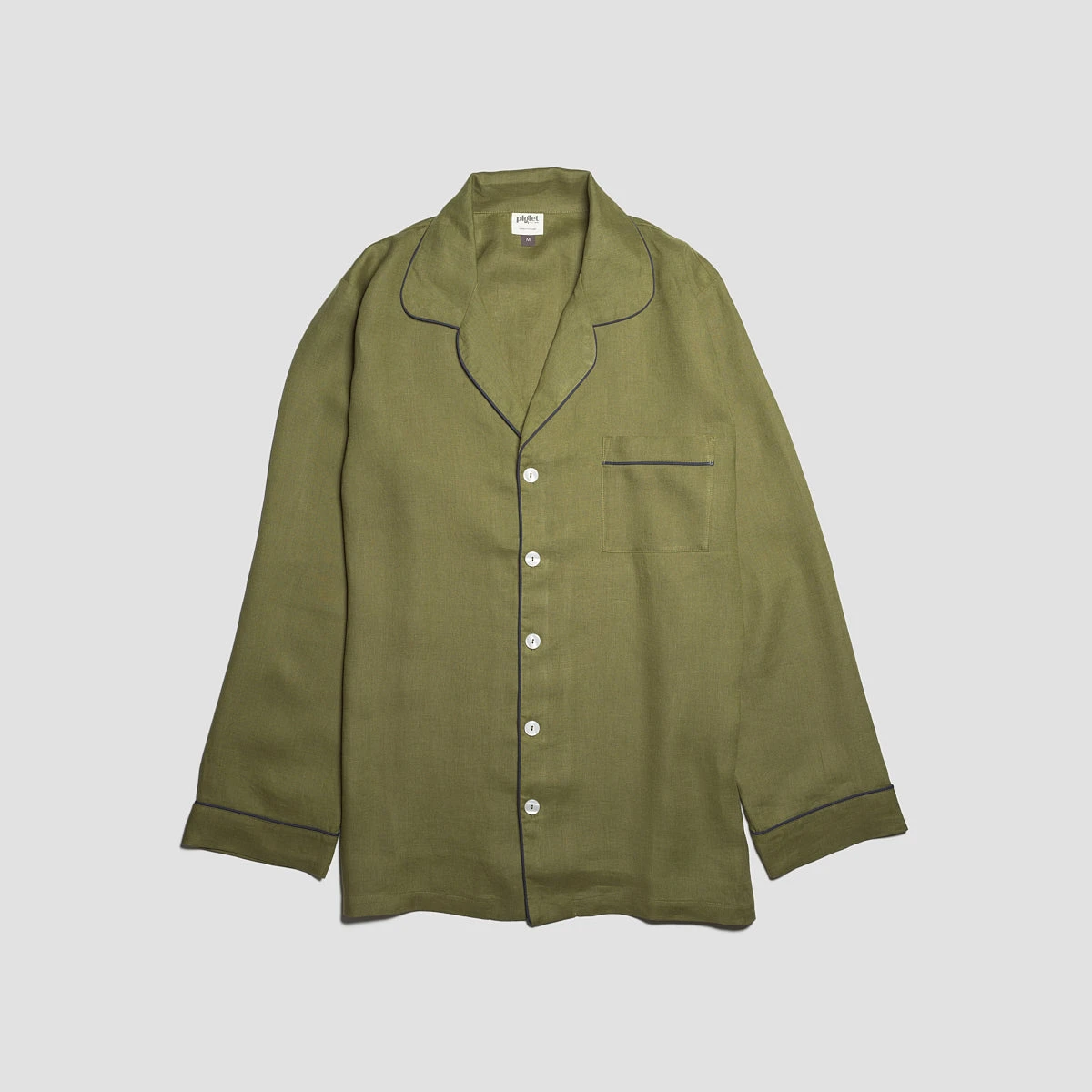 Made for those who like their sleepwear to be timeless yet comfortable, our green Men’s Moss Pajama Shirt is made from super soft 100% stonewashed linen, embellished with navy blue piping. Linen keeps you cozy and warm in the winter and cool in the summer. Our linen pajama shirt can be paired with our pajama trousers to complete the look.